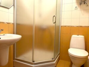 Vonios kambaryje yra dušas, tualetas, kriauklė.