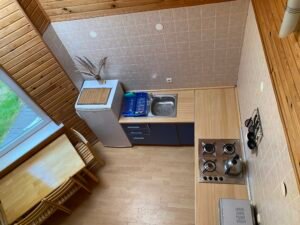 Apartamento virtuvė turinti dujinę, šaldytuva, visus reikalingiausius indus, mikrobangų krosnelė, įrankius ir puodus/keptuves.